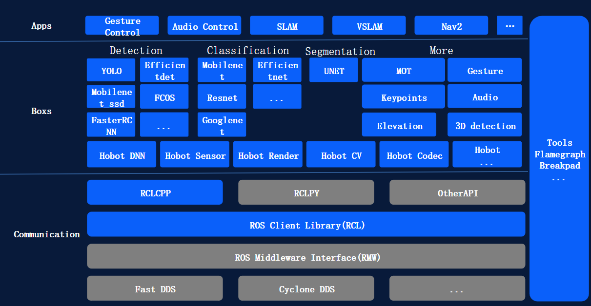 OriginTank以ROS2及TogetheROS™.Bot(地瓜机器人深入优化的ROS开源机器人操作系统)作为机器人软件系统,兼容ROS生态中的众多应用功能,即装即用;原装应用丰富,快速开始人体模仿学习、视觉巡线、AI语音交互等应用开发。
